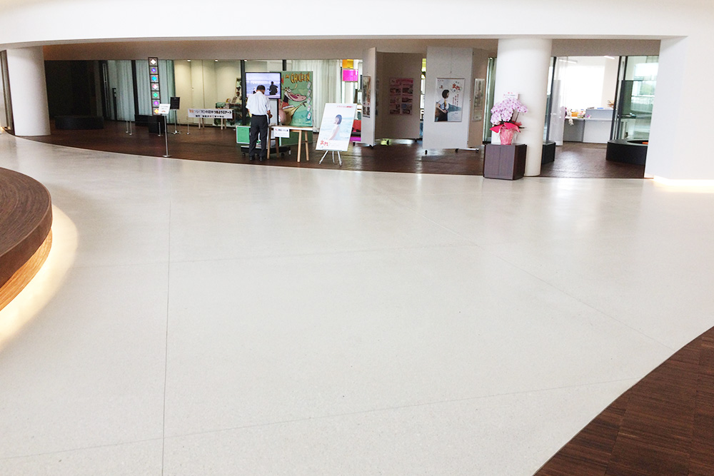 新旧コンクリート床の表面を数種類の特殊機械や特殊ダイヤで研磨、平滑で鏡面のような光沢性がありながら滑りにくい長期間の美観性・機能性を維持できるコンクリート床を形成。